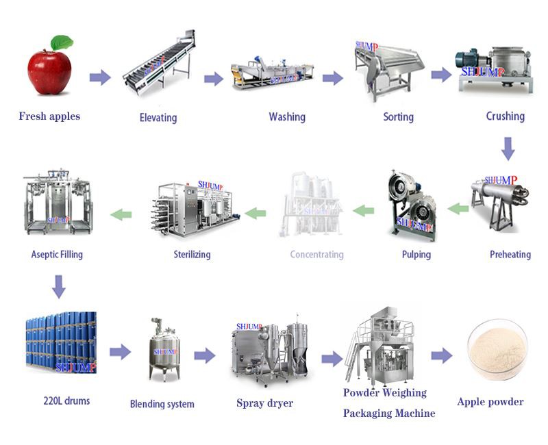 2. Sembur serbuk epal kering; Aliran proses serbuk epal pengeringan semburan biasa adalah seperti berikut: